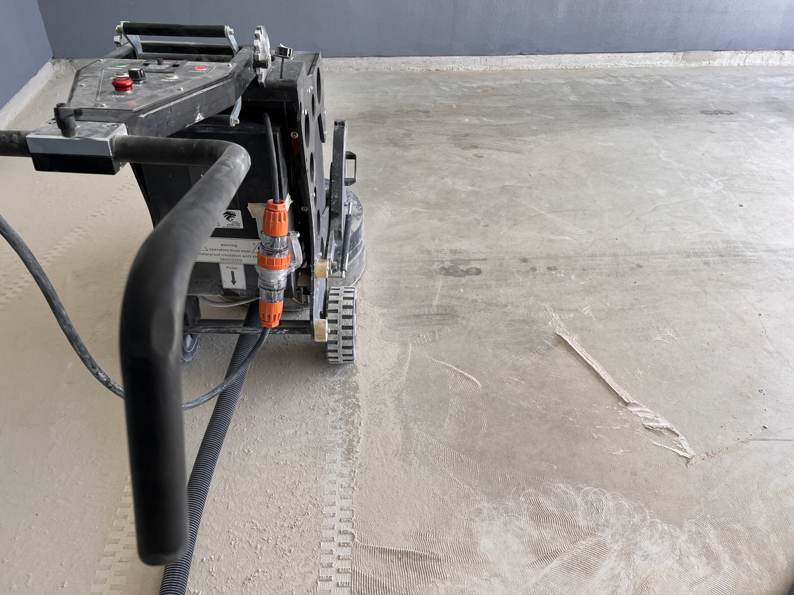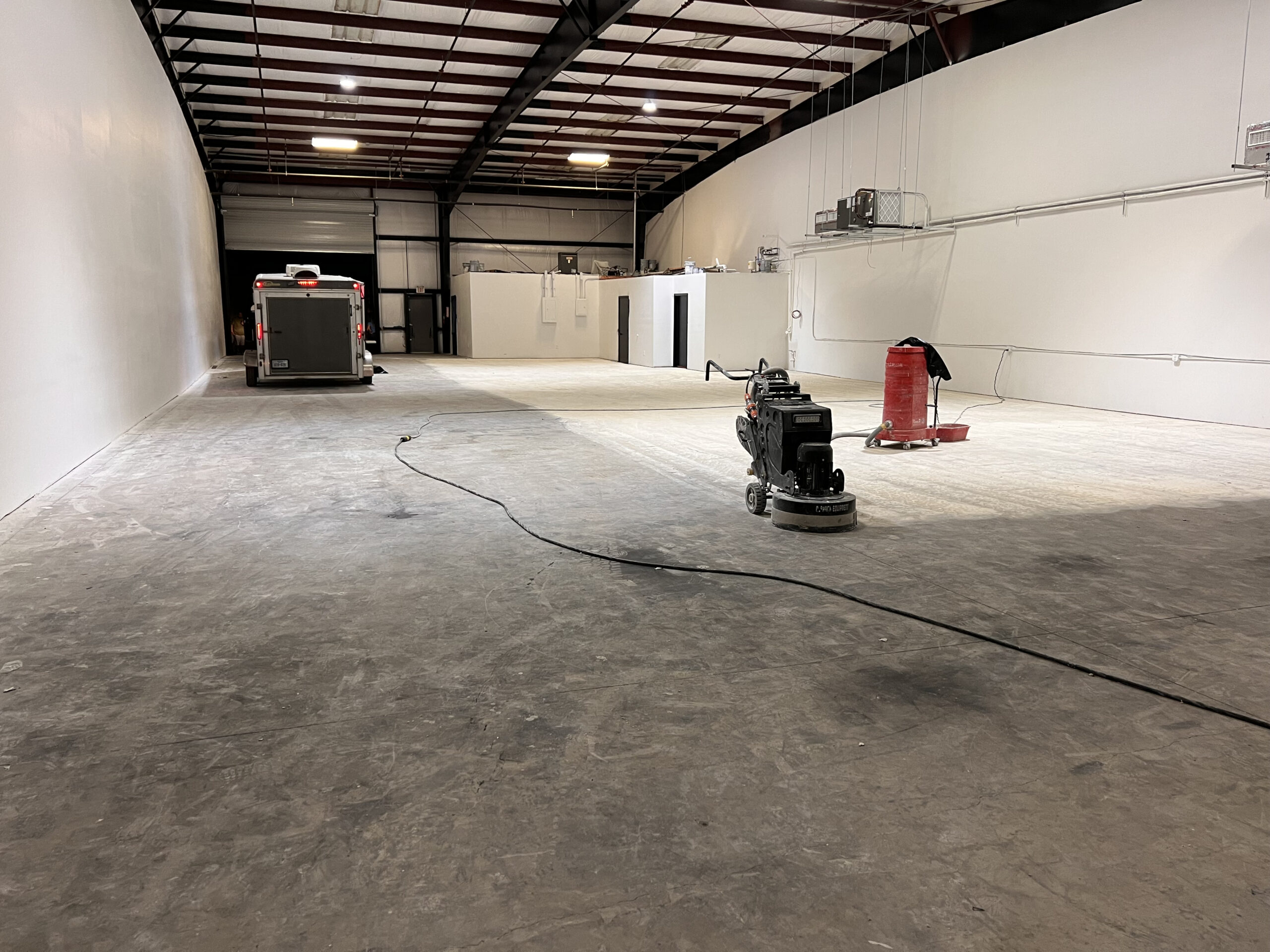 We begin by grinding, etching, and power washing your concrete surface, followed by filling any cracks with our two-part solution to ensure a smooth foundation.