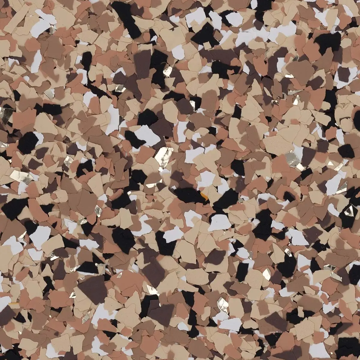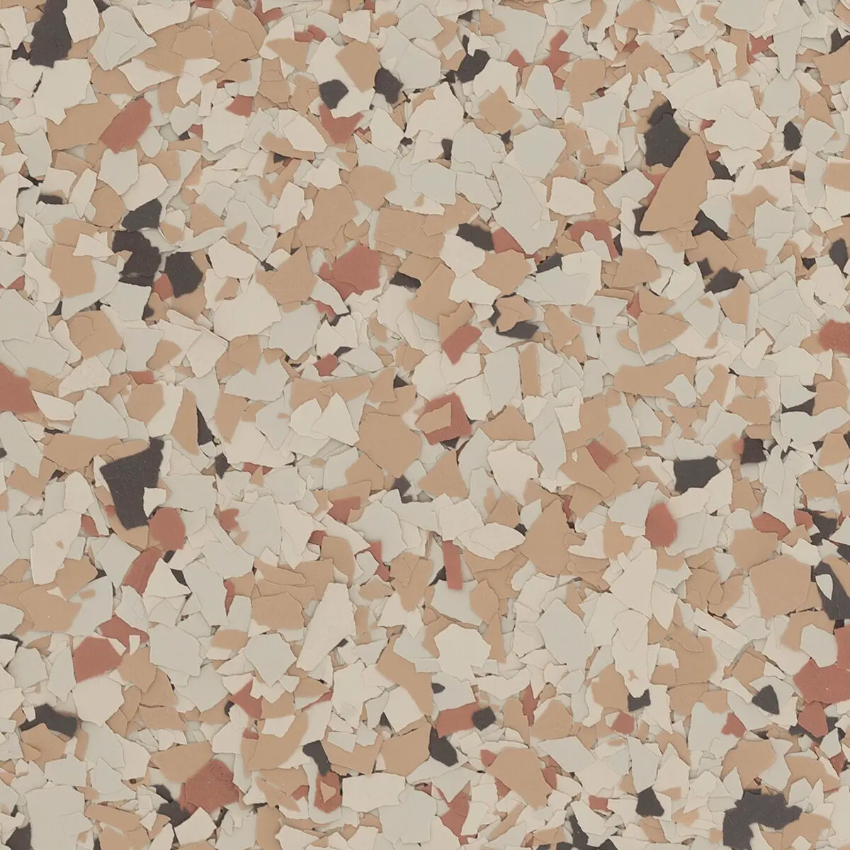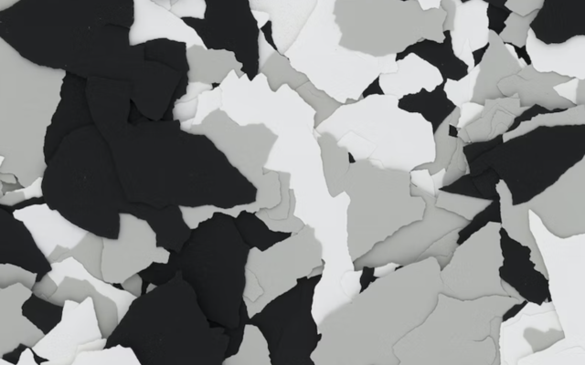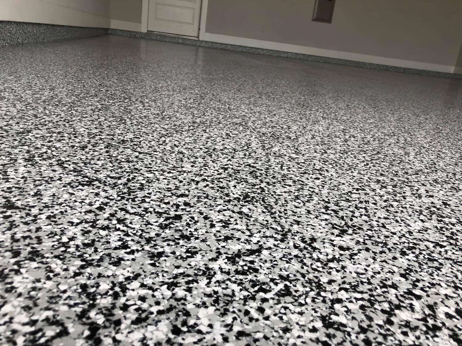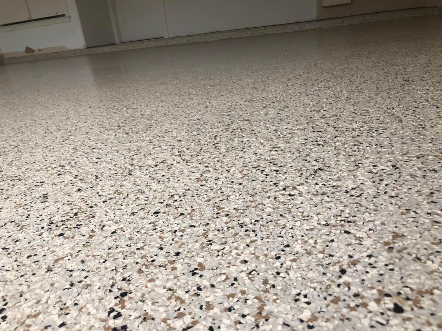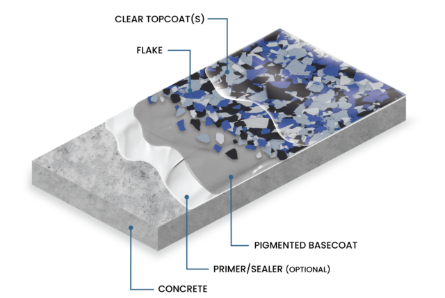 Next, we apply a base coat of epoxy, which serves as the primary layer for solid epoxy floors. This base coat comes in your choice of color. We then add decorative flakes, either for a partial flake look or a full coverage effect. For full flake applications, we select a base color that complements your chosen flakes, as the flakes will cover the entire base coat.